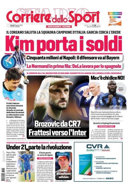Il Corriere dello Sport, nell'edizione campana, apre con "Kim porta i soldi". Il coreano saluta la squadra campione d'Italia: Garcia cerca l'erede. Cinquanta milioni al Napoli: il difensore va al Bayern. Le Normand in prima fila: DeLa lavora per lo spagnolo. Il club tedesco eserciterà domani la clausola. Assalto al centrale della Real Sociedad. Le alternative sono Konatè e Kilman.
