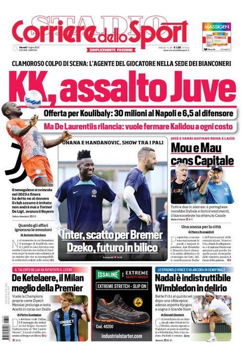 Il Corriere dello Sport, edizione Campania, dedica spazio in prima pagina al calciomercato del Napoli: "KK, assalto Juve. Clamoroso colpo di scena: l'agente del giocatore nella sede dei bianconeri. Offerta per Kouliably: 30 milioni al Napoli e 6,5 al difensore. Ma De Laurentiis rilancia: vuole fermare Kalidou a ogni costo".