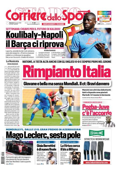 Il Correre dello Sport, nell'edizione campana, apre con "Koulibaly-Napoli, il Barça ci riprova". Settimana-chiave per il futuro di Kalidou. Laporta, presidente del club catalano, esce allo scoperto: "Pronti a risanare i debiti e a rinforzare la squadra". DeLa non fa sconti: chiede 40 milioni.