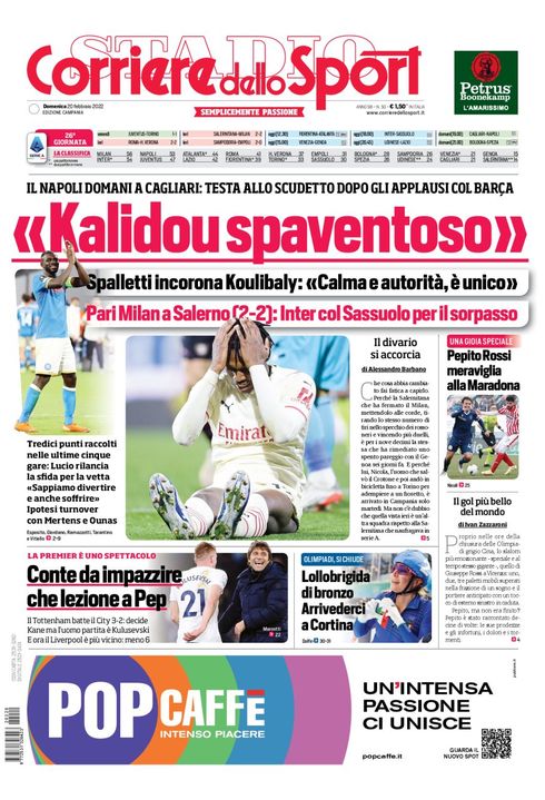 Il Corriere dello Sport, nell'edizione campana, apre con le dichiarazioni dell'allenatore azzurro: "Koulibaly spaventoso". Spalletti incorona il difensore: "Calma e autorità, è unico".