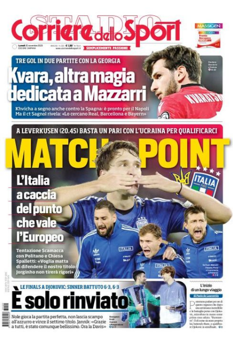 Il Corriere dello Sport, edizione Campania, ha dedicato spazio in prima pagina al match tra Italia e Ucraina: "Match Point. A Leverkusen (20:45) basta un pari con l'Ucraina per qualificarci. L'Italia a caccia del punto che vale l'Europeo". C'è spazio anche per il Napoli: "Kvara, altra magia dedicata a Mazzarri. Tre gol in due partite con la Georgia".