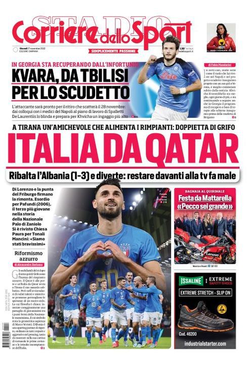 Il Corriere dello Sport, edizione Campania, dedica spazio in prima pagina all'Italia di Roberto Mancini: "Italia da Qatar. A Tirana un'amichevole che alimenta i rimpianti: doppietta di Grifo. Ribalta l'Albania (1-3) e diverte: restare davanti alla tv fa male". C'è spazio anche per il Napoli: "Kvara, da Tbilisi per lo Scudetto".