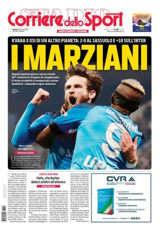 Il Corriere dello Sport, nell'edizione campana, apre con la vittoria del Napoli contro il Sassuolo arrivata grazie a due grandissimi gol di Kvaratskhelia ed Osimhen: "I marziani. Kvara e Osi di un altro pianeta: 2-0 al Sassuolo e +18 sull'Inter. Napoli spettacolare e senza rivali: 20esima vittoria in 23 gare di campionato. Il terzo scudetto è sempre più vicino, Spalletti: "Squadra super matura".