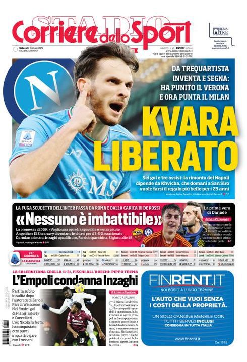Il Corriere dello Sport, nell'edizione campana, apre con il big match tra Milan e Napoli soffermandosi sull'azzurro Kvaratskhelia: "Kvara liberato. Da trequartista inventa e segna: ha punito il Verona e ora punta il Milan. Sei gol e tre assist: la rimonta del Napoli dipende da Khvicha, che domani a San Siro vuole farsi il regalo più bello per i 23 anni".
