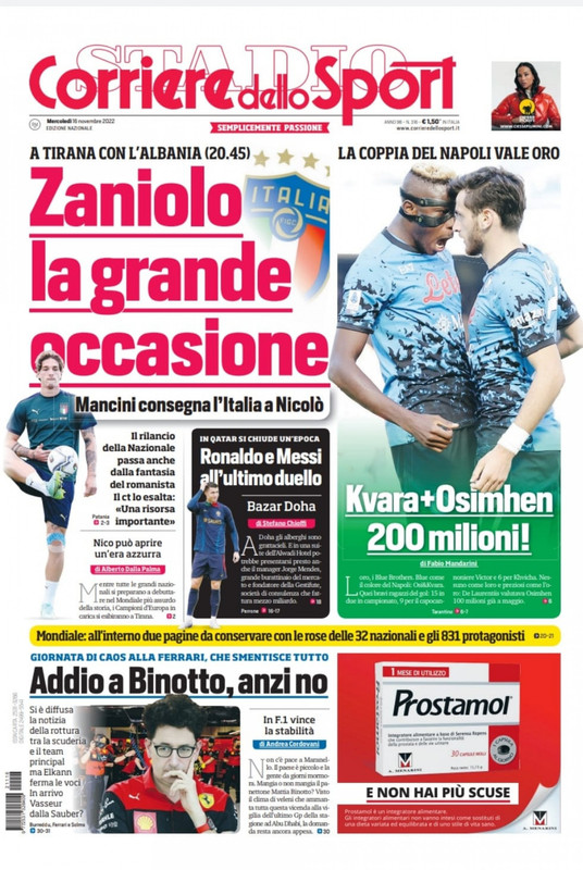 Il Corriere dello Sport, nell'edizione campana, apre parlando degli azzurri Khvicha Kvaratskhelia e Victor Osimhen: "Kvara+Osimhen: 200 milioni. La coppia del napoli vale oro".