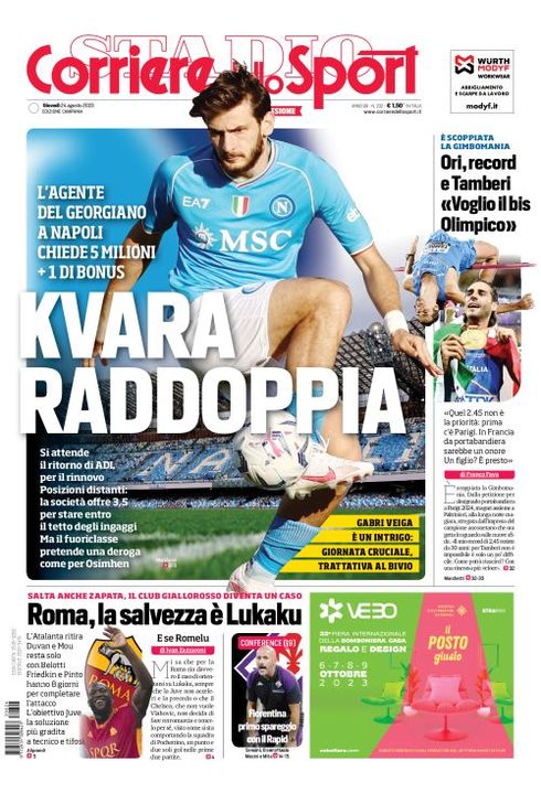 Il Corriere dello Sport, edizione Campania, dedica spazio in prima pagina al Napoli e al rinnovo di Kvaratskhelia: "Kvara raddoppia. L'agente del georgiano a Napoli chiede 5 milioni + 1 di bonus. Si attende il ritorno di ADL per il rinnovo. Posizioni distanti: la società offre 3,5 per stare entro il tetto degli ingaggi, ma il fuoriclasse pretende una deroga come per Osimhen". C'è spazio anche per il mercato azzurro: "Gabri Veiga è un intrigo. Giornata cruciale, trattativa al bivio".