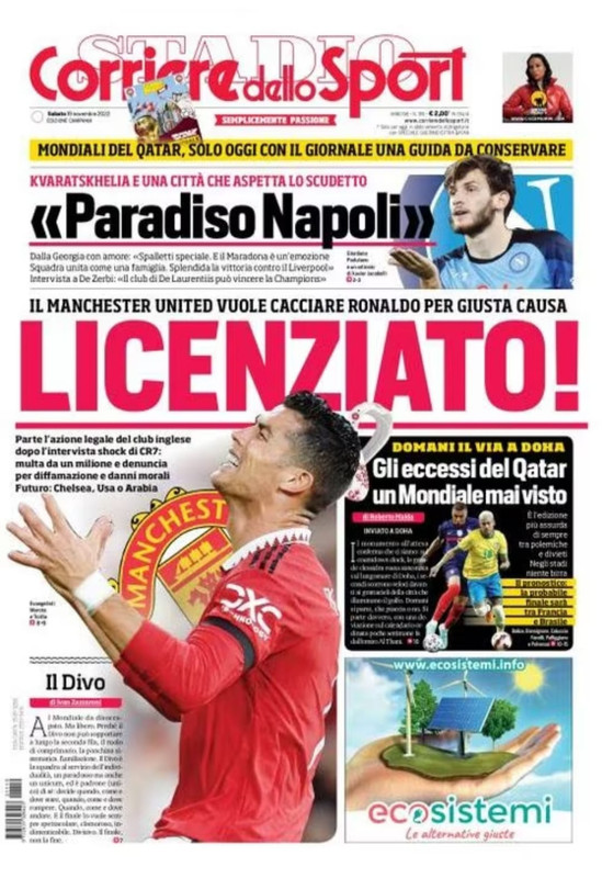 Il Corriere dello Sport, nell'edizione campana, apre con le parole dell'esterno azzurro Khvicha Kvaratskhelia: "Kvaratskhelia e una città che aspetta lo scudetto: "Paradiso Napoli". Dalla Georgia ccon amore: "Spalletti speciale. E il Maradona è un'emozione. Squadra unita come una famiglia. Splendida la vittoria contro il Liverpool". Intervista a De Zerbi: "Il club di De Laurentiis può vincere la Champions".