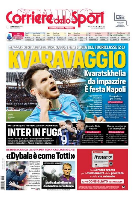 Il Corriere dello Sport, edizione Campania, dedica spazio in prima pagina alla vittoria del Napoli contro il Verona: "Kvaravaggio. Mazzarri ribalta il Verona con una magia del fuoriclasse (2-1). Kvaratskhelia da impazzire. E' festa Napoli".