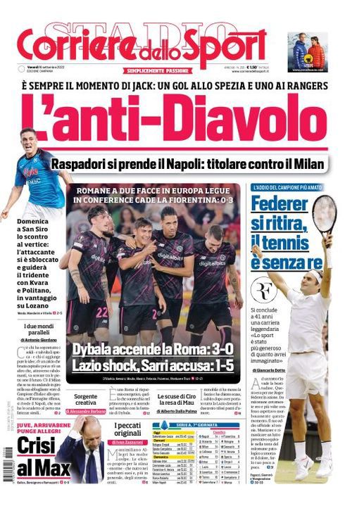 Il Corriere dello Sport, edizione Campania, dedica spazio al Napoli e la sfida contro il Milan: "L'anti-Diavolo. E' sempre il momento di Jack: un gol allo Spezia e uno ai Rangers. Raspadori si prende il Napoli: titolare contro il Milan".