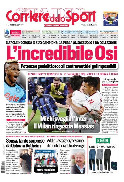 Il Corriere dello Sport, nell'edizione campana, apre parlando del centravanti azzurro Victor Osimhen: "L'incredibile Osi. Napoli incorona il suo campione: la perla al Sassuolo è da collezione. Potenza e genialità: ecco il centravanti dei gol impossibili. Nove reti nelle ultime sette giornate: Victor meglio di Higuain. Prenota una notte da protagonista anche martedì a Francoforte".
