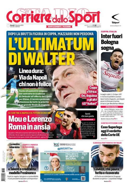 Il Corriere dello Sport, edizione Campania, ha dedicato spazio in prima pagina al Napoli: "L'ultimatum di Walter. Linea dura: via da Napoli chi non è felice. Dopo la brutta figura in Coppa, Mazzarri non perdona".