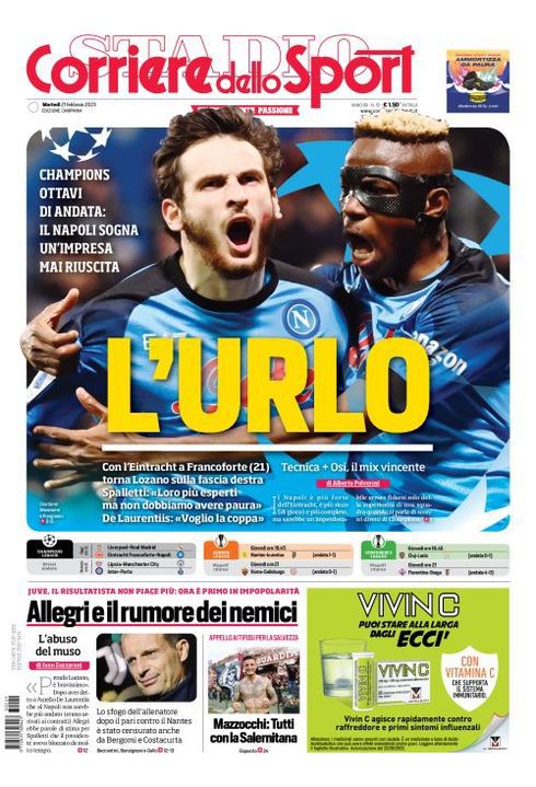 Il Corriere dello Sport, nell'edizione campana, apre con "L'urlo". Champions ottavi di andata: il Napoli sogna un'impresa mai riuscita. Con l'Eintracht a Francoforte (21) torna Lozano sulla fascia destra. Spalletti: "Loro più esperti, ma non dobbiamo avere paura". De Laurentiis: "Voglio la coppa". Tecnica+Osi, il mix vincente.