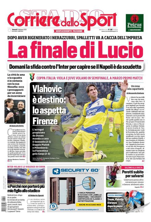 Il Corriere dello Sport, nell'edizione campana, apre con il match Napoli-Inter: "La finale di Lucio". Dopo aver rigenerato i nerazzurri, Spalletti va a caccia dell'impresa. La sfida contro l'Inter per capire se il Napoli è da scudetto.