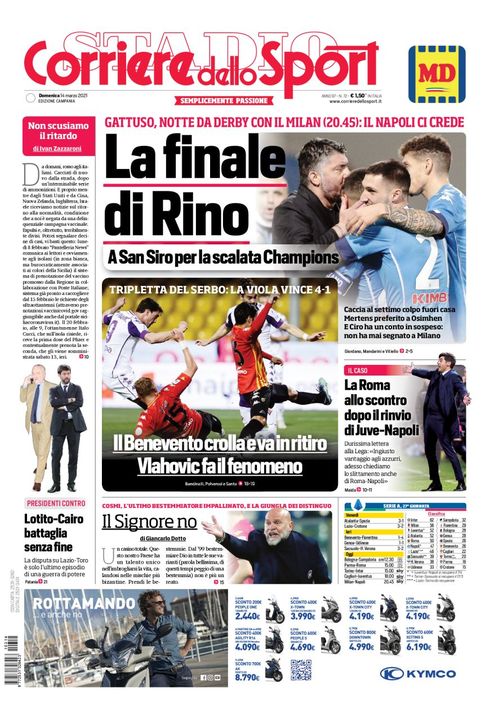 "La finale di Rino", così titola la prima pagina del quotidiano Il Corriere dello Sport nella sua edizione Campania. "A San Siro per la scalata Champions. Gattuso, notte da derby con il Milan alle ore 20:45: il Napoli ci crede. Caccia al settimo colpo fuori casa. Mertens preferito a Osimhen e Ciro ha un conto in sospeso: non ha mai segnato a Milano".