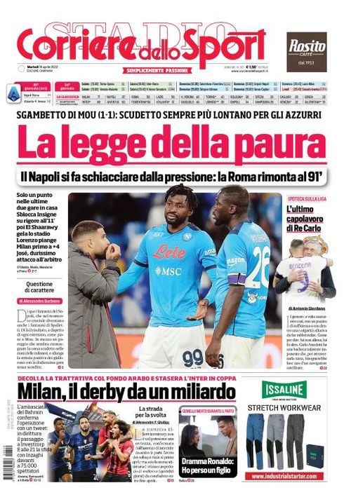 Il Corriere dello Sport, nell'edizione campana, apre con il pari tra Napoli e Roma: "La legge della paura". Sgambetto di Mou (1-1): scudetto sempre più lontano per gli azzurri. Il Napoli si fa schiacciare dalla pressione: la Roma rimonta al 91'.