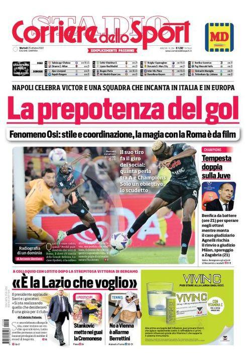 Il Corriere dello Sport, nell'edizione campana, apre con "La prepotenza del gol". Napoli celebra Victor e una squadra che incanta in Italia e in Europa. Fenomeno Osi: stile e coordinazione, la magia con la Roma è da film. Il suo tiro fa il giro dei social: quinta perla tra A e Champions. Solo un obiettivo: lo scudetto.