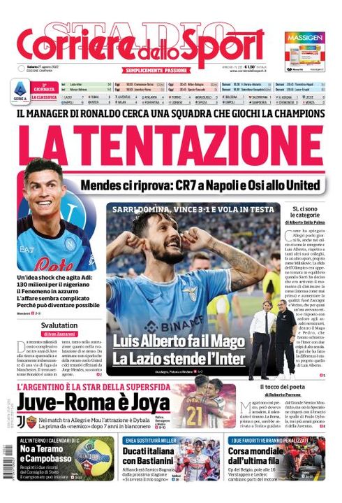 Il Corriere dello Sport, nell'edizione campana, apre con le voci legate al possibile arrivo al Napoli di Cristiano Ronaldo: "La tentazione. Mendes ci riprova: CR7 a Napoli e Osi allo United. Il manager di Ronaldo cerca una squadra che giochi la Champions. Un'idea shock che agita ADL: 130 milioni per il nigeriano, il Fenomeno in azzurro. L'affare sembra complicato. Perchè può diventare possibile".