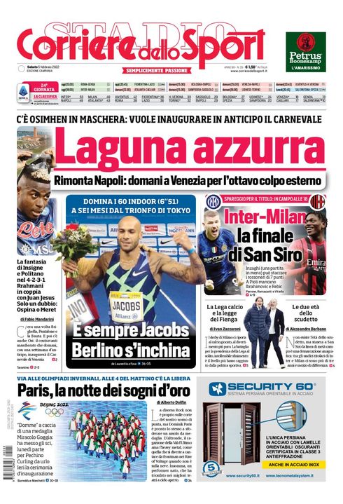 Il Corriere dello Sport, nell'edizione campana, apre con la sfida tra Venezia e Napoli: "Laguna azzurra. Rimonta Napoli: domani a Venezia per l'ottavo colpo esterno. C'è Osimhen in maschera: vuole inaugurare in anticipo il carnevale".