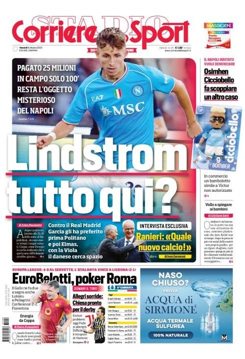 Il Corriere dello Sport, nell'edizione campana, apre con "Lindstrom, tutto qui?". Pagato 25 milioni in campo solo 100'. Resta l'oggetto misterioso del Napoli. Contro il Real Madrid Garcia gli ha preferito prima Politano e poi Elmas. Con la Viola il danese cerca spazio. Spazio anche a "Osimhen Cicciobello fa scoppiare un altro caso". In basso, l'intervista all'allenatore del Cagliari, Claudio Ranieri: "Quale nuovo calcio!". Poi la vittoria della Roma in Europa League "EuroBelotti, poker Roma" e la Juventus "Allegri sorride, Chiesa pronto per il derby".