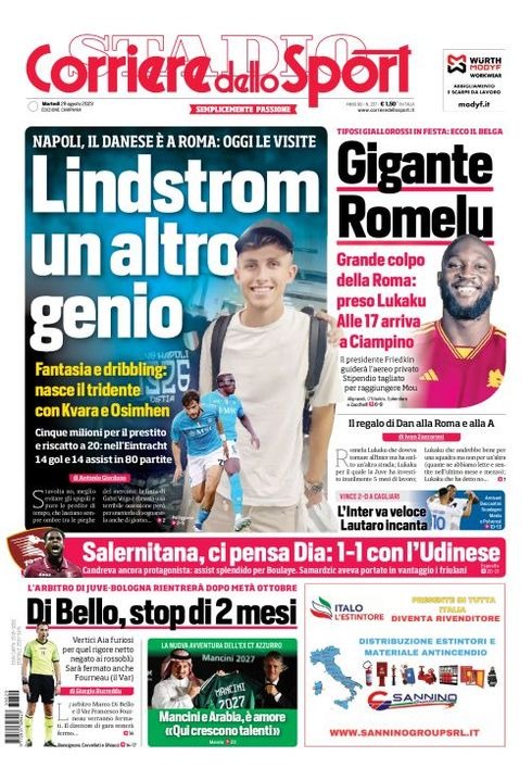 Il Corriere dello Sport, nell'edizione campana, apre con "Lindstrom un altro genio". Napoli, il danese è a Roma: oggi le visite. Fantasia e dribbling: nasce il tridente con Kvara e Osimhen. Cinque milioni per il prestito e riscatto a 20: nell'Eintracht 14 gol e 14 assist in 80 partite.