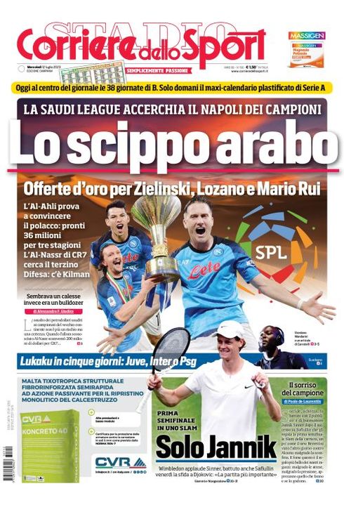 Il Corriere dello Sport, nell'edizione campana, apre con gli interessamenti da parte dei club arabi per gli azzurri Zielinski, Lozano e Mario Rui: "Lo scippo arabo. Offerte d'oro per Zielinski, Lozano e Mario Rui. La Saudi League accerchia il Napoli dei campioni. L'Al-Ahli prova a convincere il polacco: pronti 36 milioni per tre stagioni. L'Al-Nassr di CR7 cerca il terzino. Difesa: c'è Kilman".