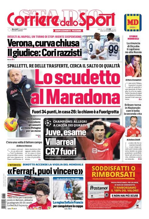 Il Corriere dello Sport, nell'edizione campana, apre con la corsa allo scudetto in Serie A che vede tra i protagonisti anche il Napoli: "Lo scudetto al Maradona. Spalletti, re delle trasferte, cerca il salto di qualità. Fuori 34 punti, in casa 26: la chiave è a Fuorigrotta".