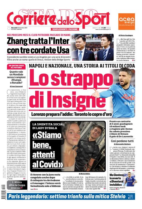 Il Corriere dello Sport, nell'edizione campana, apre con il possibile addio al Napoli di Lorenzo Insigne: "Lo strappo di Insigne. Napoli e nazionale, una storia ai titoli di coda. Lorenzo prepara l'addio: Toronto lo copre d'oro. Pronto un contratto di 5 anni: guadagnerà 10 milioni lordi a stagione più i bonus. Da sabato prossimo è libero di firmare. Il gelo di De Laurentiis".