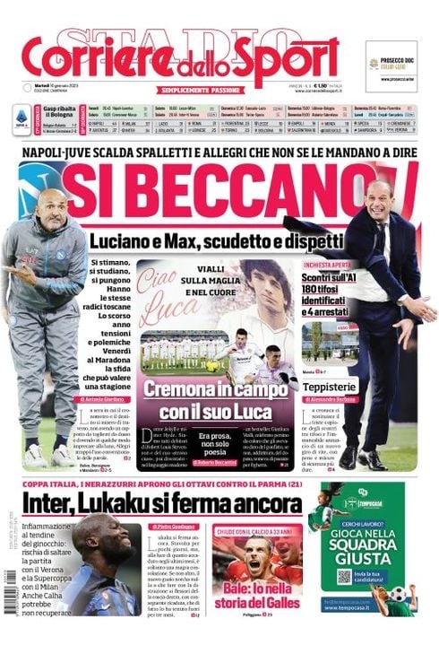 Il Corriere dello Sport, nell'edizione campana, apre con "Si beccano". Napoli-Juve scalda Spalletti e Allegri che non se le mandano a dire. Luciano e Max, scudetto e dispetti. Si stimano, si studiano, si pungono. Hanno le stesse radici toscane. Lo scorso anno tensioni e polemiche. Venerdì al Maradona la sfida che può valere una stagione. Scontri sull'A1: 180 tifosi identificati e 4 arresti.