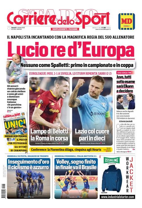 Il Corriere dello Sport, nell'edizione campana, apre con "Lucio, re d'Europa". Il Napoli sta incantando con la magnifica regia del suo allenatore. Nessuno come Spalletti: primo in campionato e in coppa. Gli azzurri stanno giocando un calcio stellare e sono gli unici a dominare ovunque. Calzona: "In panchina c'è un genio".