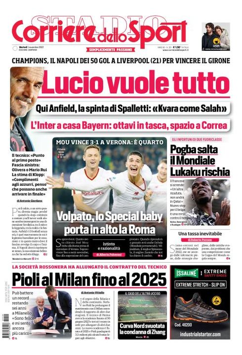Il Corriere dello Sport, nell'edizione campana, apre con "Lucio vuole tutto". Champions, il Napoli dei 50 gol a Liverpool (21) per vincere il girone. Qui Anfield, la spinta di Spalletti: "Kvara come Salah". Il tecnico: "Punto al primo posto". Fascia sinistra: Olivera o Mario Rui. La stima di Klopp: "Complimenti agli azzurri, penso che possano arrivare anche in finale".