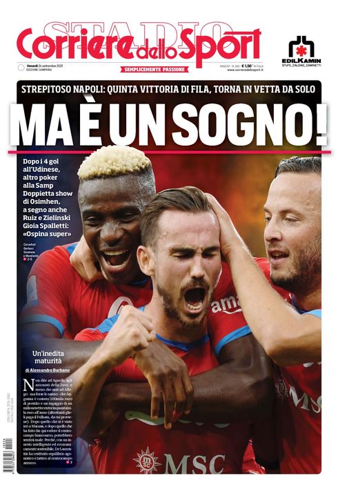 Il Corriere dello Sport, nell'edizione Campania, apre in prima pagina con la vittoria degli azzurri contro la Sampdoria: "Ma è un sogno! Strepitoso Napoli, quinta vittoria di fila, torna in vetta da solo. Dopo i 4 gol all'Udinese, altro poker alla Samp. Doppietta show di Osimhen, a segno anche Ruiz e Zielinski". Gioia Spalletti: "Ospina super".