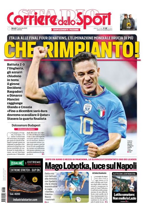 Il Corriere dello Sport, nell'edizione campana, apre con "Che rimpianto!". Italia alle Final Four di Nations, l'eliminazione Mondiale brucia di più. Battuta 2-0 l'Ungheria. Gli azzurri chiudono in testa al girone. Decidono Raspadori e Dimarco. Mancini raggiunge Olanda e Croazia: "Fino a dicembre sarà dura, dovremo scavallare il Qatar". Stasera la qurta finalista. In basso "Mago Lobotka, luce sul Napoli". Dopo un anno e mezzo in panchina, lo slovacco è diventato uno dei leader. Dalla crisi con Gattuso alla rivincita con Spalletti che lo ritiene insostituibile in regia: "Sembra Iniesta". Riecco i nazionali.