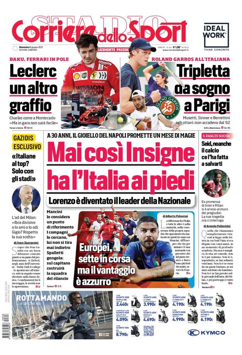 "Mai così Insigne, ha l'Italia ai piedi", titola l'edizione campana del Corriere dello Sport, sottolineando quanto il capitano del Napoli sia diventato importante anche per la Nazionale di Mancini. "A 30 anni il gioiello del Napoli promette un mese di magie, Lorenzo è diventato il leader della Nazionale", prosegue il quotidiano. Poi spazio a Roland Garros e alla Ferrari.