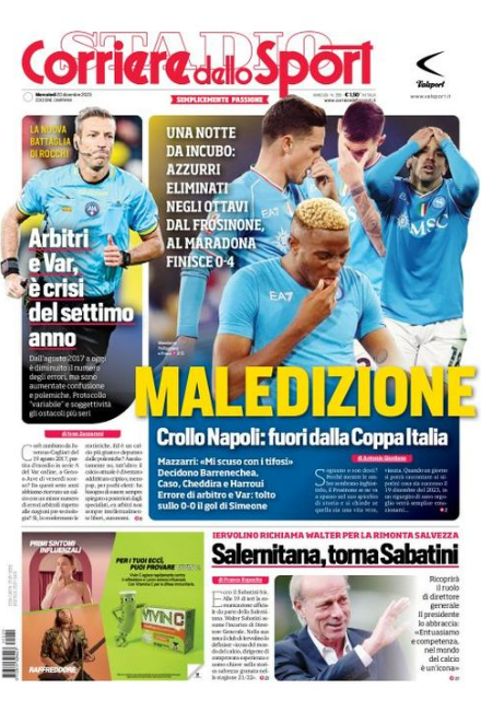 Il Corriere dello Sport, edizione Campania, dedica spazio in prima pagina al Napoli e all'eliminazione dalla Coppa Italia: "Maledizione. Crollo Napoli: fuori dalla Coppa Italia. Una notte da incubo: azzurri eliminati negli ottavi dal Frosinone, al Maradona finisce 0-4".