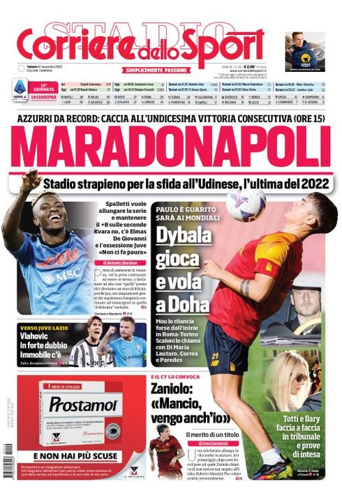 Il Corriere dello Sport, nell'edizione campana, apre con il match tra Napoli e Udinese al Maradona: "Maradonapoli. Stadio strapieno per la sfida all'Udinese, l'ultima del 2022. Azzurri da record: caccia all'undicesima vittoria consecutiva (ore 15). Spalletti vuole allungare la serie e mantenere il +8 sulle seconde. Kvara no, c'è Elmas. De Giovanni e l'ossessione Juve: "Non ci fa paura".