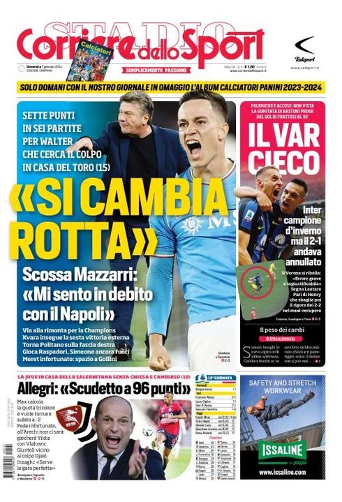 Il Corriere dello Sport, nell'edizione campana, apre con le dichiarazioni dell'allenatore del Napoli Walter Mazzarri alla vigilia del match contro il Torino: "Si cambia rotta. Mi sento in debito con il Napoli". Sette punti in sei partite per Walter, che cerca il colpo in casa del Toro (15). Via alla rimonta per la Champions. Kvara insegue la sesta vittoria esterna. Torna Politano sulla fascia destra. Gioca Raspadori, Simeone ancora fuori. Meret infortunato: spazio a Gollini. Spazio anche alle polemiche in Inter-Verona "Il VAR cieco". In basso, le parole dell'allenatore della Juventus Massimiliano Allegri: "Scudetto a 96 punti" e il calendario e la classifica della Serie A.