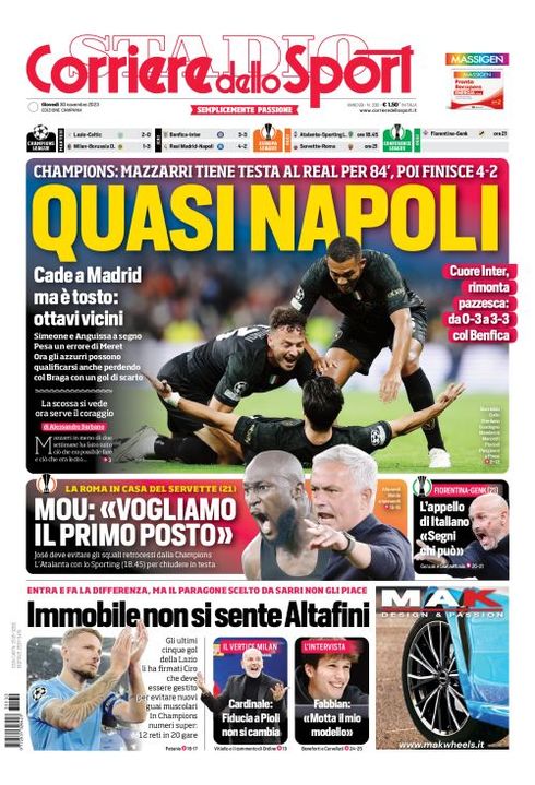 Il Corriere dello Sport, edizione Campania, ha dedicato spazio in prima pagina al Napoli: "Quasi Napoli. Champion: Mazzarri tiene testa al Real per 84 minuti, poi finisce 4-2. Cade a Madrid ma è tosto: ottavi vicini". C'è spazio anche per l'Inter: "Cuore Inter, rimonta pazzesca: da 0-3 a 3-3 col Benfica".