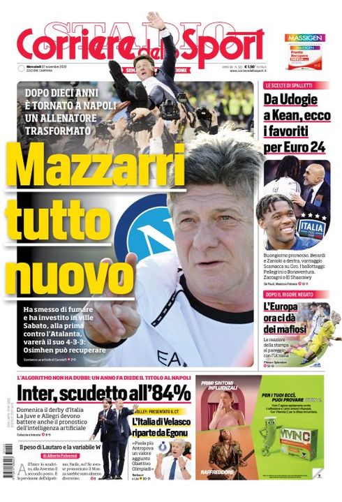 Il Corriere dello Sport, nell'edizione campana, apre parlando dell'allenatore azzurro Walter Mazzarri: "Mazzarri tutto nuovo. Dopo dieci anni è tornato a Napoli un allenatore trasformato. Ha smesso di fumare e ha investito in ville. Sabato, alla prima contro l'Atalanta, varerà il suo 4-3-3: Osimhen può recuperare".