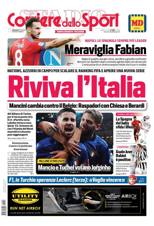 Il Corriere dello Sport, nell'edizione Campania, apre con il centrocampista spagnolo: "Meraviglia Fabian". Napoli, lo spagnolo sempre più leader: "Regia di qualità, due gol, corsa, sacrificio e grande continuità. Decisivo con Spalletti, dopo un'estate agitata dalle voci di mercato. L'evoluzione di un centrocampista totale che il suo ct snobba".