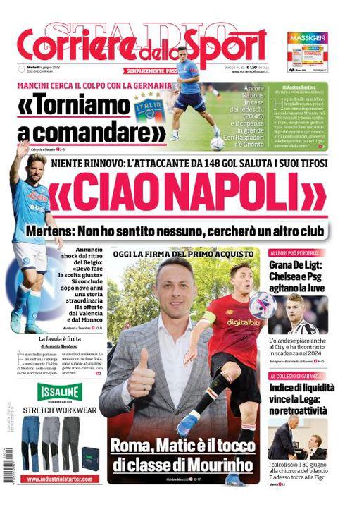 Il Corriere dello Sport, edizione Campania, dedica spazio in prima pagina al Napoli e al possibile addio di Dries Mertens dopo le parole del belga dal ritiro della nazionale: "Ciao Napoli, niente rinnovo: l'attaccante da 148 gol saluta i suoi tifosi. Mertens: 'Non ho sentito nessuno, cercherò un altro club".