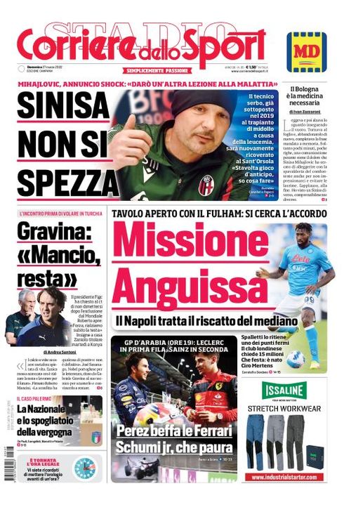 Il Corriere dello Sport, nell'edizione campana, apre con "Missione Anguissa". Il Napoli tratta il riscatto del mediano. Tavolo aperto con il Fulham: si cerca l'accordo. In alto l'annuncio shock di Mihajlovic: "Darò un'altra lezione alla malattia". "Sinisa non si spezza".