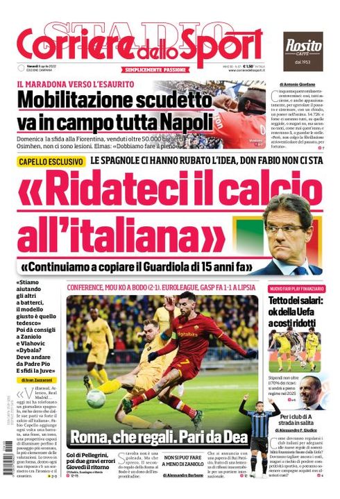 Il Corriere dello Sport, nell'edizione campana apre con la sfida al Maradona contro la Fiorentina: "Mobilitazione scudetto, va in campo tutta Napoli". Venduti oltre 50mila biglietti. Osimhen, non ci sono lesioni. Elmas: "Dobbiamo fare il pieno".