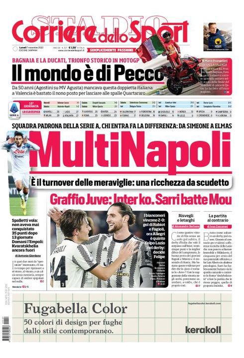 Il Corriere dello Sport, edizione Campania, ha dedicato spazio in prima pagina al Napoli: "MultiNapoli. Squadra padrona della Serie A, chi entra fa la differenza: da Simeone a Elmas. E' il turnover delle meraviglie: una ricchezza da scudetto". C'è spazio anche per le sfide di Serie A: "Graffio Juve: Inter ko. Sarri batte Mou", e per l'impresa di Bagnaia in MotoGp: "Il mondo è di Pecco".
