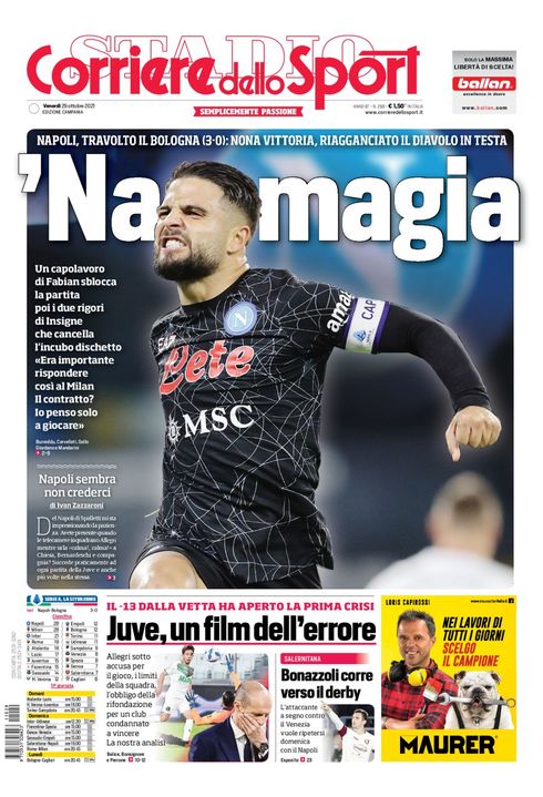 Il Corriere dello Sport, nell'edizione campana, apre con la vittoria del Napoli contro il Bologna: “’Na magia”. Nona vittoria, riagganciato il Diavolo in testa. Un capolavoro di Fabian sblocca la partita, poi due rigori di Insigne che cancella l'incubo dischetto: "Era importante rispondere così al Milan? Il contratto? Io penso solo a giocare".