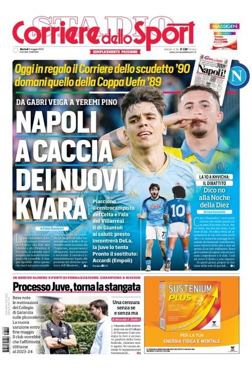 Il Corriere dello Sport, nell'edizione campana, apre con "Napoli a caccia dei nuovi Kvara". Da Gabri Veiga a Yeremi Pino. Piacciono il centrocampista del Celta e l'ala del Villarreal. Il d.s. Giuntoli ai saluti: presto incontrerà DeLa, la Juve lo tenta. Pronto il sostituto: Accardi (Empoli).