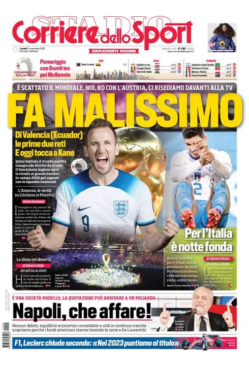 Il Corriere dello Sport, edizione Campania, dedica spazio al Mondiale: "Fa Malissimo. E' scattato il Mondiale. Noi, ko con l'Austria, ci risediamo davanti alla TV. Di Valencia (Ecuador) le prime due reti. E oggi tocca a Kane". C'è spazio anche per la sconfitta dell'Italia: "Per l'Italia è notte fonda", e per il Napoli: "Napoli, che affare! E' una società modello, la quotazione può arrivare a un miliardo".