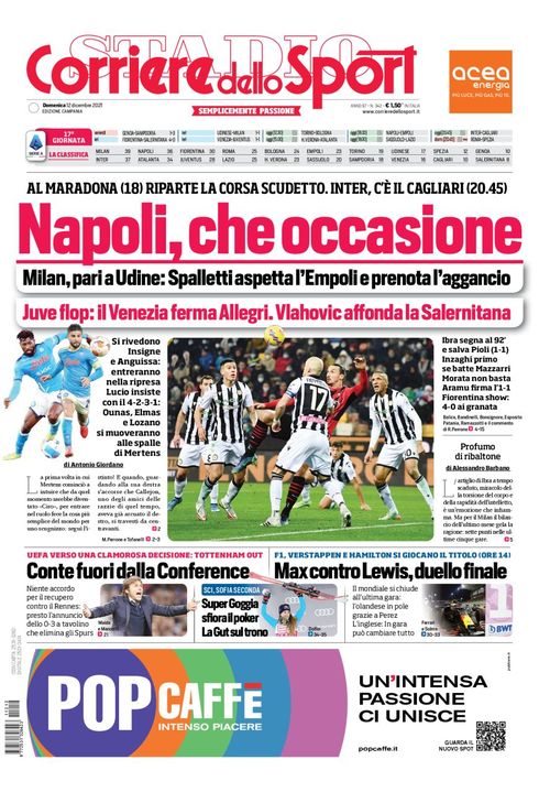 Il Corriere dello Sport, nell'edizione campana, apre con "Napoli, che occasione". Al Maradona (18) riparte la corsa scudetto. Inter, c'è il Cagliari (20:45). Milan, pari a Udine: Spalletti aspetta l'Empoli e prenota l'aggancio.