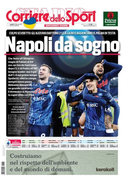 Il Corriere dello Sport, nell'edizione campana, apre con la vittoria del Napoli all'Olimpico contro la Lazio: "Napoli da sogno".