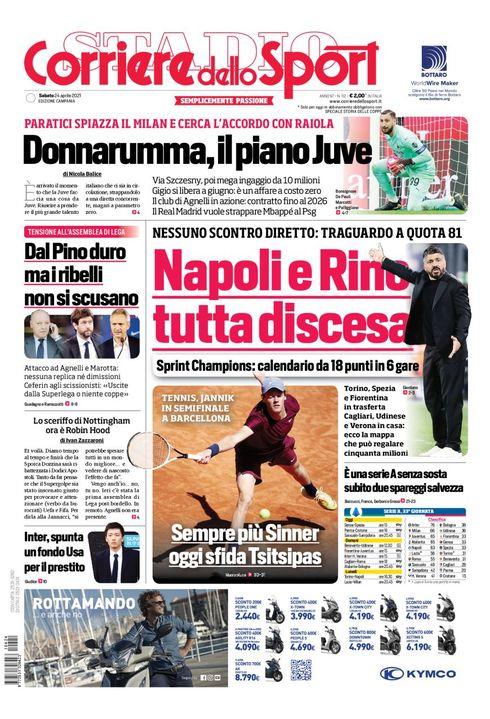 "Napoli e Rino tutta discesa", apre così la prima pagina Il Corriere dello Sport nella sua edizione Campania. "Nessuno scontro diretto: traguardo a quota 81. Sprint Champions: calendario da 18 punti in 6 gare. Torino, Spezia e Fiorentina in trasferta. Cagliari, Udinese e Verona in casa: ecco la mappa che può regalare cinquanta milioni".