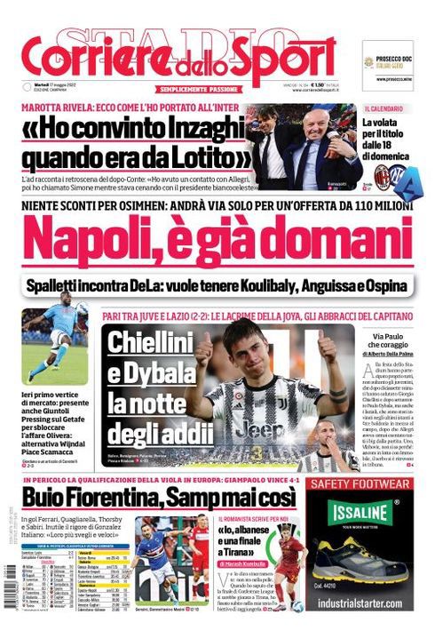 Il Corriere dello Sport, nell'edizione campana, apre con "Napoli, è già domani". Spalletti incontra DeLa: vuole tenere Koulibaly, Anguissa e Ospina. Ieri primo vertice di mercato: presente anche Giuntoli. Pressing sul Getafe per sbloccare l'affare Olivera: alternativa Wijndal. Piace Scamacca. Niente sconti per Osimhen: andrà via solo per un'offerta da 110 milioni.